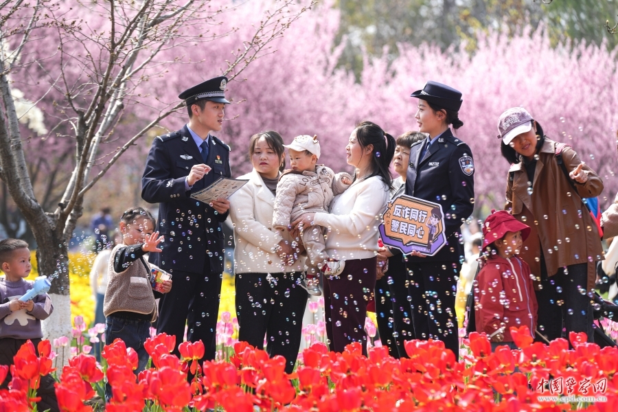 连日来,江苏省淮安市公安局清江浦分局民警深入辖区景区,开展反诈宣传,提升群众反诈意识,在春日花海中筑牢安全防线。图为3月25日,民警向群众宣传反诈。周尧 摄